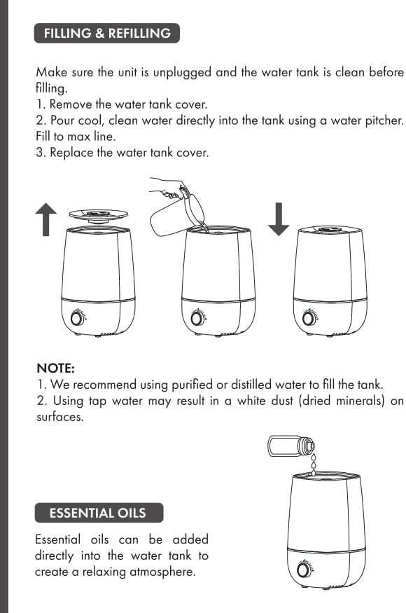 - TOP-FILL DESIGN: Effortlessly refill your cool mist humidifier without spills or mess. The convenient top-fill humidifier system ensures easy access for adding water or cleaning, making it perfect for home, bedroom, nursery, and office use.