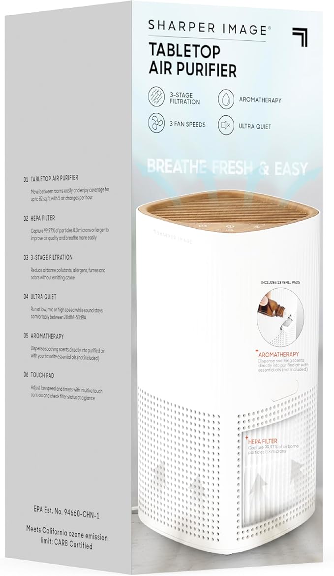 Sharper Image® Tabletop Air Purifier – 2 HEPA Filters & 13 Aromatherapy Pads| Quiet 3-Stage Filtration| 5 Air Changes Per Hour| Remove Dust Allergens Pollen Smoke Pet Fur| Home Office Odor Eliminator