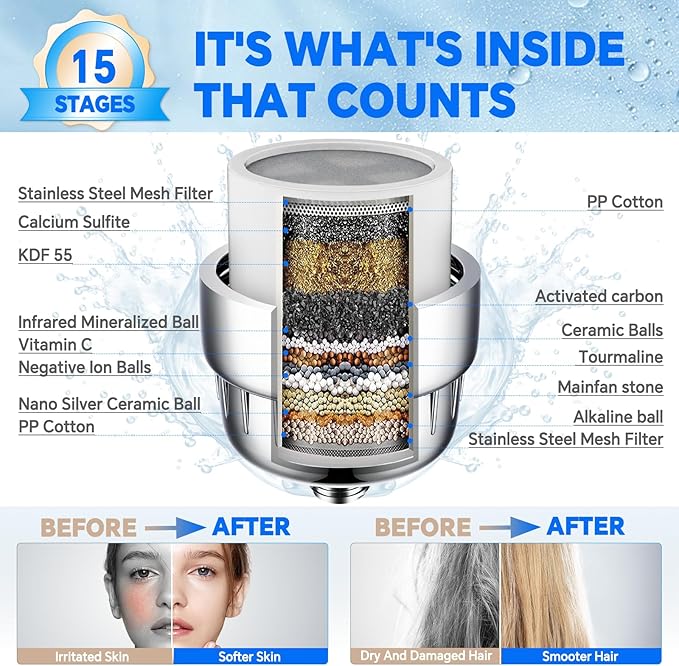 - SOFT WATER MAKE SKIN HAIR HEALTH: Multi-Stage shower head filters effectively filtering harmful substances in water, eliminates odors, reduce skin itching, allergies, dry hair, flaky dandruff, and brittle nails. Improve condition of your skin, hair and nails. Soft water can also protect your shower system, extend lifespan, and reduce the risk of shower head damage and falling off.
