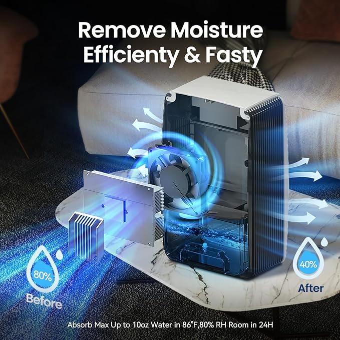 - 【Portable Dehumidifier for Bathroom】 Featuring a compact design (8.27 x 5.91 x 13.94 inches) and a built-in handle, this dehumidifier is easy to move and place anywhere. Perfect for removing excess moisture in bedrooms, RV, Basement