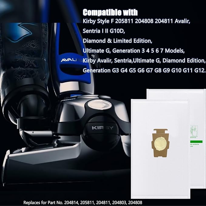 - 【Compatible model】204814 205811 Micron Magic HEPA Filter Plus Vacuum Bags Compatible with kirby Style F 205811 204808 204811 Avalir, Sentria I II G10D, Diamond & Limited Edition, Ultimate G, Generation 3 4 5 6 7 Models,Fit for Avalir, Sentria, Ultimate G, Diamond Edition, Generation G3 G4 G5 G6 G7 G8 G9 G10 G11 G12.