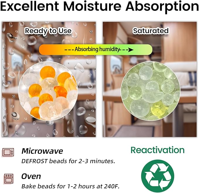 - Indicating - Orange beads changging green; The clear window makes it easy to monitor the silica gel's moisture absorption, allowing you to conveniently check the absorption level of the desiccant packs. A color change from orange to light green signifies that the environmental RH is above 50% and that moisture absorption is nearing saturation, indicating the need for reactivation. However, it's crucial to note that even after the initial color change, nearly half of the absorption capacity remains available for moisture absorption.