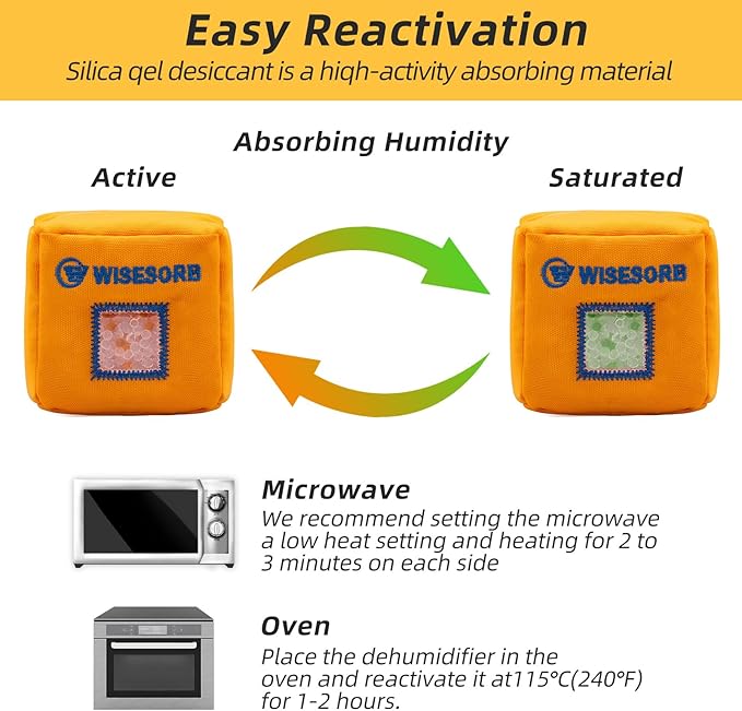 - Rechargeable by Oven - Place the dehumidifier in the oven and reactivate it at115°C(240°F) for 1-2 hours.