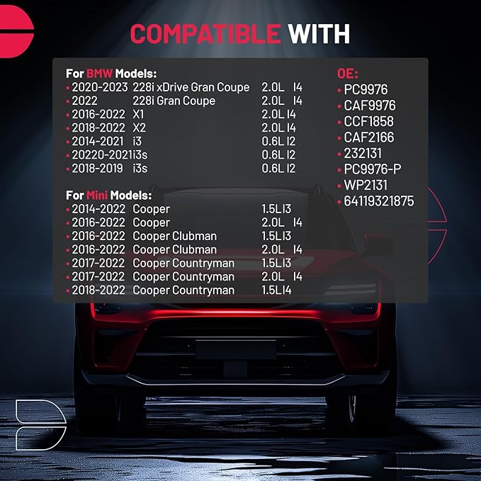 - [Vehicle Fitment] Compatible with BMW X1 2016-2022 2.0L l4, X2 2018-2022 2.0L l4, i3 2014-2021 0.6L l2, i3s 2018-2021 0.6L l2, 228i xDrive Gran Coupe 2020-2023 2.0L l4, 228i Gran Coupe 2022 2.0L l4; Compatible with Mini Cooper 2014-2022 1.5L l3, Cooper 2016-2022 2.0L l4, Cooper Clubman 2016-2022 1.5L l3/ 2.0L l4, Cooper Countryman 2017-2022 1.5L l3/ 2.0L l4
