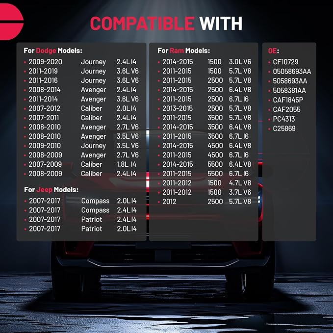 - [Vehicle Fitment] Compatible with Dodge Journey 2009-2020, Avenger 2008-2014, Caliber 2007-2012; Compatible with Jeep Compass 2007-2017, Patriot 2007-2017; Compatible with Ram 1500/2500/3500/4500/5500 2011-2015; Compatible with Chrysler 200 2011-2014, Sebring 2007-2010