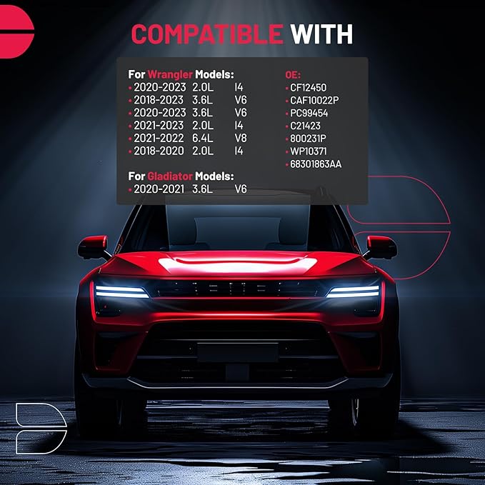 - [Vehicle Fitment] Compatible with Jeep Wrangler 2020-2023 2.0L l4, Wrangler 2018-2023 3.6L V6, Wrangler 2021-2022 6.4L V8, Gladiator 2020-2021 3.6L V6