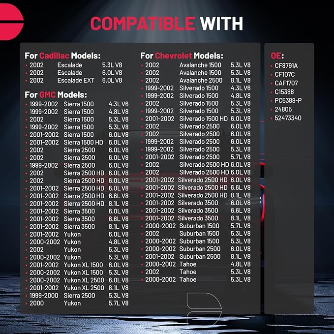 - [Vehicle Fitment] Compatible with Cadillac Escalade/Escalade EXT 2002; Compatible with Chevry Avalanche 1500/2500/ Silverado 2500 HD 2002, Silverado 1500/2500 1999-2002, Silverado 1500 HD/2500 HD 2001-2002, Silverado 3500 2001-2002, Suburban 1500/2500/ Tahoe 2000-2002; Compatible with GMC Sierra 1500/2500 1999-2002, Sierra 1500 HD/2500 HD/3500/ 2001-2002, Yukon/Yukon XL 1500/2500 2000-2002