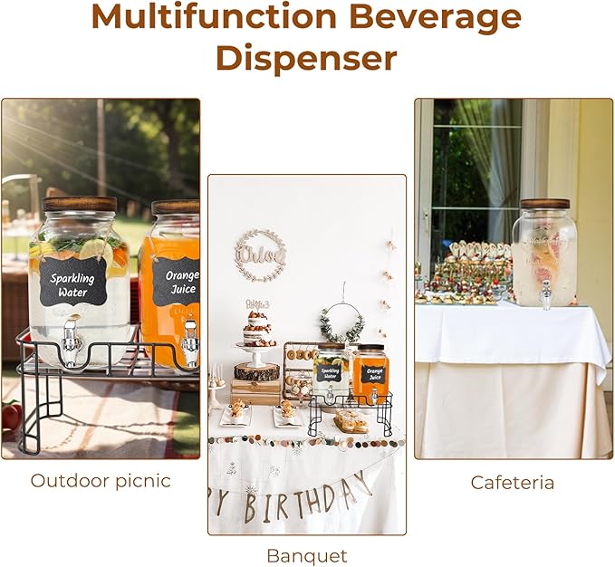 - Packaging Includes: 2 Pack 1 Gallon glass drink dispenser with wood lids, 2 ABS Spigots, 2 tag labels, 1 metal bracket and a marker pen