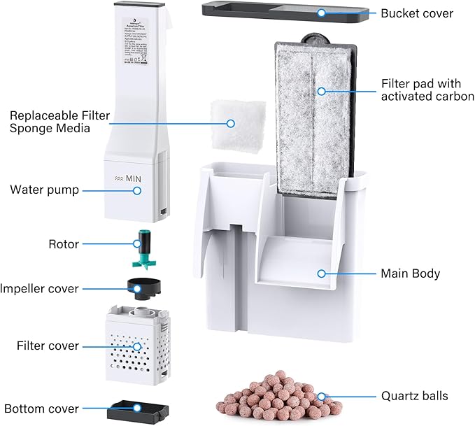 - Triple-Layer Filtration System: β Removable bottom sponge for coarse debris filtration; β‘ Bio-ceramic quartz balls (included) to neutralize heavy metals and organic waste; β’ Replaceable Cartridge: Activated carbon core with dual-sided sponge effectively neutralizes odors and impurities