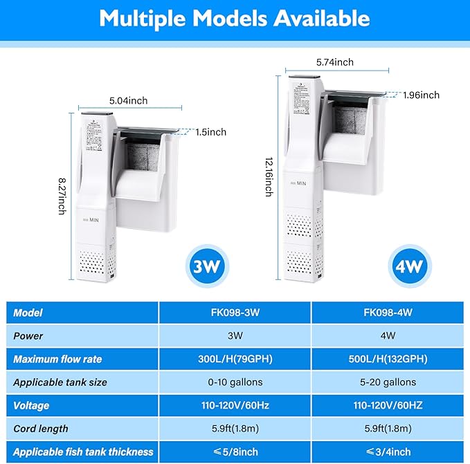 - Easy Installation and Detach: No tools are required, and fish tank filter can be quickly installed and removed. Please note: The thickness of the fish tank for 3W is 0.625 inches, and the thickness of the fish tank for 4W is 0.75 inches