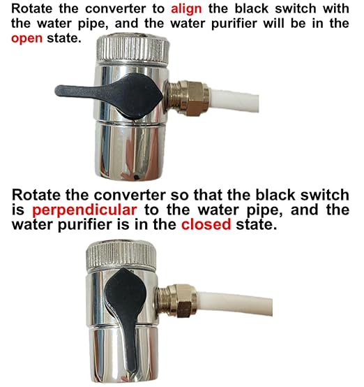 - Easy to install. Please connect the water pipe according to the label attached to the product.Rotate the converter to align the black switch with the water pipe, and the water purifier will be in the open state.Installation can be completed in just a few minutes