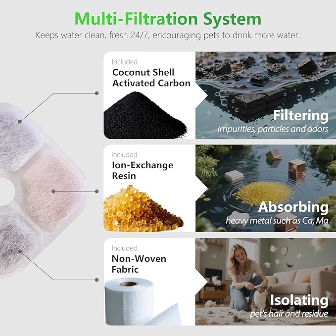 - Triple Filtration: The filters for cat water fountain feature 3-layer filtration—non-woven fabric traps cat hair & food debris; activated carbon absorbs odors, filters particles; ion-exchange resin removes heavy metals, softens water. It keeps water clean, fresh 24/7, encouraging pets to drink more for better hydration