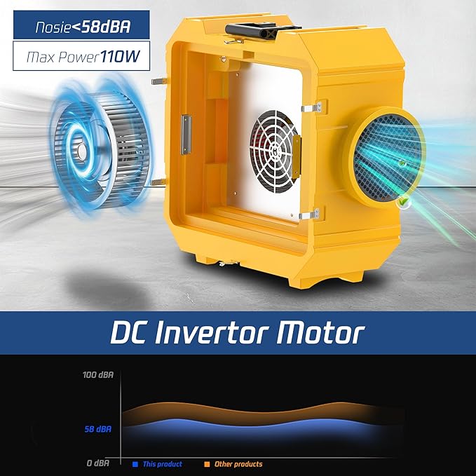 - 【Powerful Airflow and Ultra Low Noise】This commercial air purifier is equipped with advanced DC inverter motor, achieving stepless speed adjustment from 0 to 550 (CFM), capable of covering a space of 5500 cubic feet. The operating noise is as low as 58 decibels. Air scrubber is suitable for indoor decoration and demolition projects.