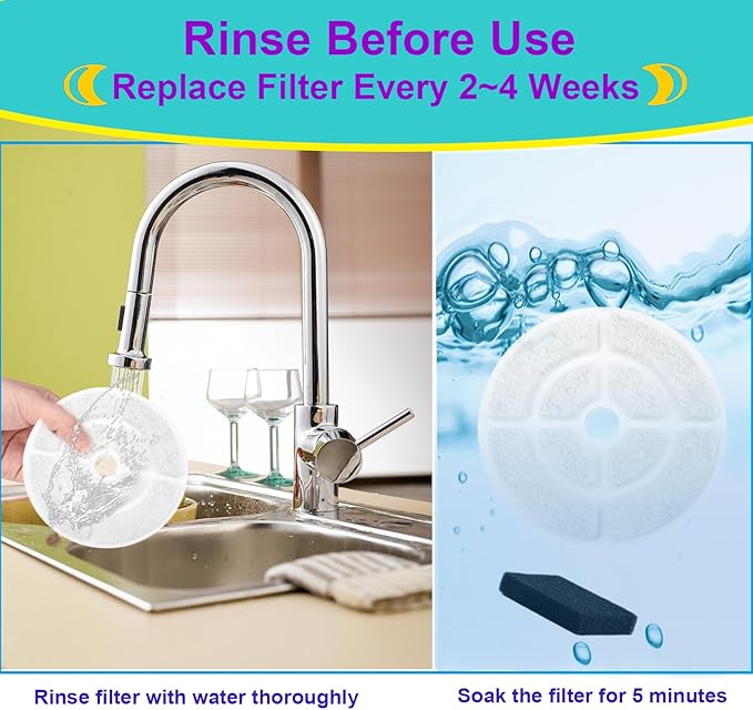 - 🐶 【Cleaning and Replacement】Please soak the pet water fountain filter in water for 5 minutes and rinse it thoroughly under running water before use. According to your pet's drinking frequency and the number of pets using the dog fountain, please replace the cat fountain filter every 2 weeks.