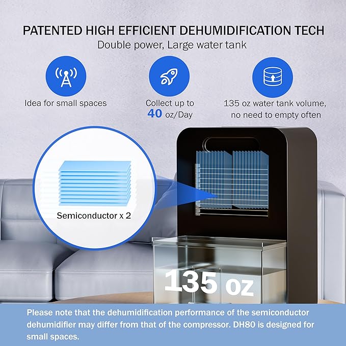 - ⭐Please note that the dehumidification performance of the semiconductor dehumidifier may differ from that of the compressor. DH80 is designed for small spaces. Instead of reducing humidity blindly, it balances humidity according to the room's humidity and temperature for an ideal range. Cannot manually set the humidity.