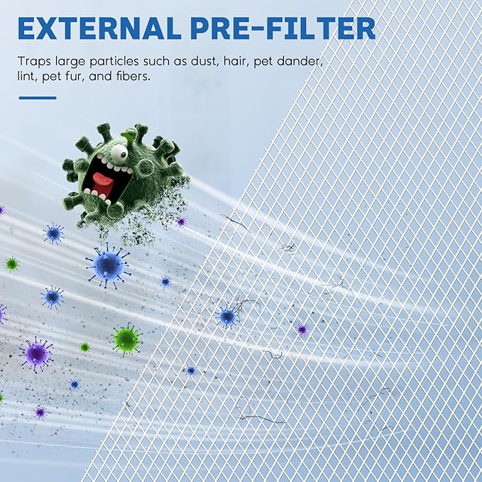 - Three-Stage Filtration System: Equipped with a pre-filter, an H13 True KJ150 filter, and an activated carbon layer, this filter effectively traps dust and odors helping reduce airborne particles and delivering cleaner.