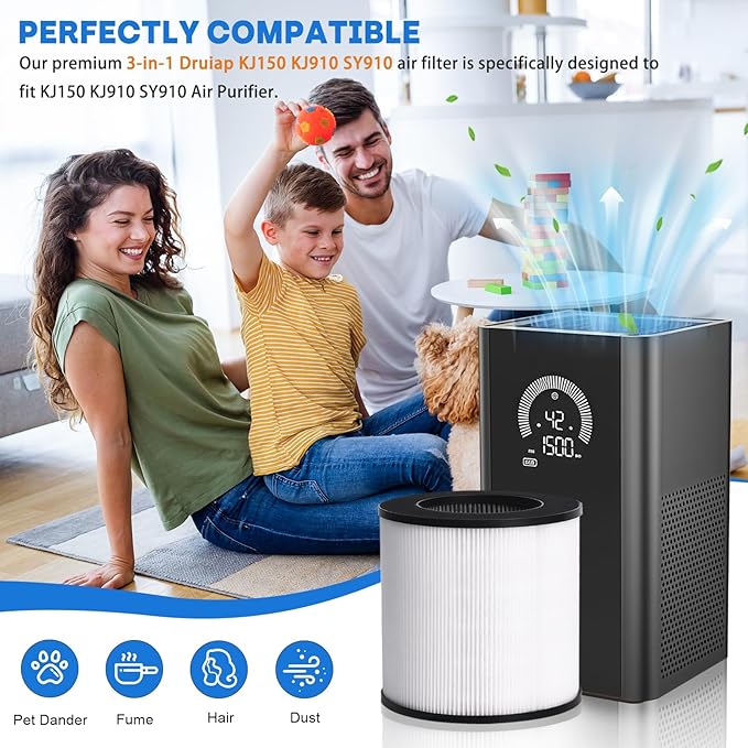 - Compatible Models: this filter replacement fits for Druiap KJ150, KJ910, and SY910 air purifiers. Not suitable for the KJ80 model. Please verify your purifier model before purchase to ensure a perfect fit and optimal performance.