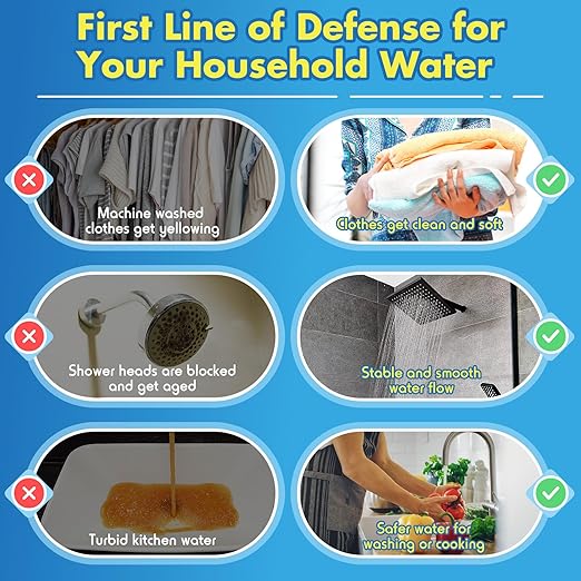 - Stable Water Flow: the whole house water purification system has been tested for more than 100, 000 times to ensure stable and safe water supply; The whole house water filter can also reduce lead, odor, sand, rust, etc. The large capacity is enough to provide a smooth and stable pure water flow for the whole family