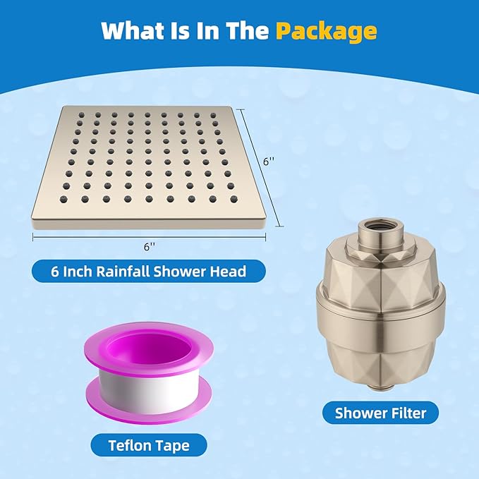 - High-quality Material: The 6-inch rainfall shower head with filter boasts a substantial, artfully crafted body of premium ABS plastic, complemented by a back panel of certified SUS 304 stainless steel. This material composition ensures the square fixed showerhead is rustproof, lightweight, and built to withstand the test of time, and it also has an excellent elegance and durability that will serve you for years to come