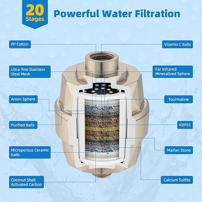 - Excellent 20 Stages Shower Head Filter: Experience the ultimate water purification with the Hibbent advanced shower filter, featuring 20-stage water filtration, redox media, calcium sulfite, activated carbon, and ceramic beads. This innovative filter effectively eliminates odours, balances pH levels, and infuses beneficial minerals into your skin, nails, and hair. Not only does it act as a moisturizer and purifier, but it also provides an unparalleled sensation for sensitive skin