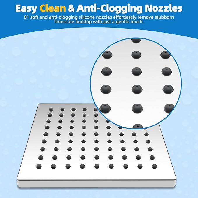 - Self-cleaning Silicone Nozzles: The rainfall shower head has 81 soft silicone nozzles, meticulously designed to prevent limescale buildup and clogging. These high-quality silicone nozzles not only ensure a safe and healthy bathing experience but also make cleaning a breeze. Wipe away any residue or buildup, and the self-cleaning properties of the silicone material will maintain the nozzles in pristine condition, ensuring an enjoyable shower every time