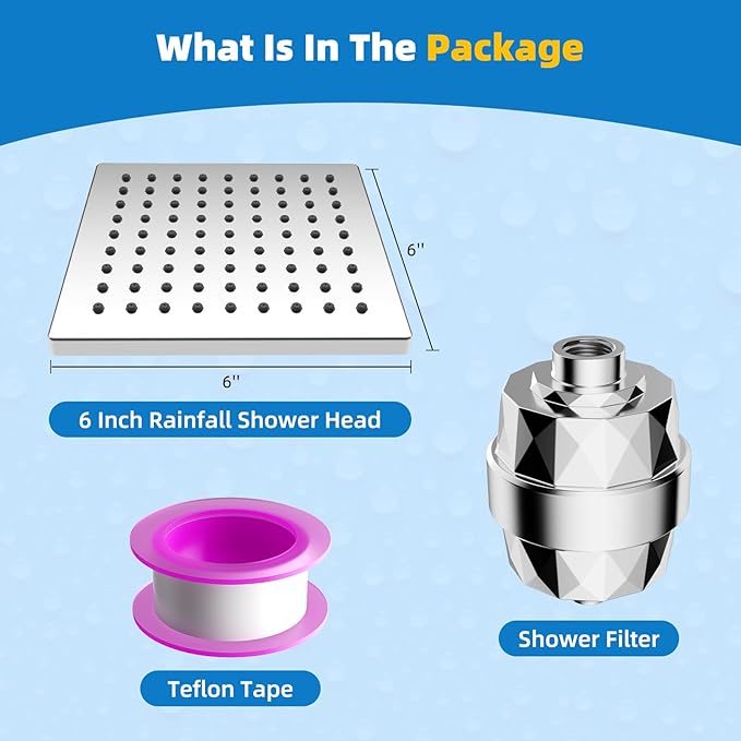 - High-quality Material: The 6-inch rainfall shower head with filter boasts a substantial, artfully crafted body of premium ABS plastic, complemented by a back panel of certified SUS 304 stainless steel. This material composition ensures the square fixed showerhead is rustproof, lightweight, and built to withstand the test of time, and it also has an excellent elegance and durability that will serve you for years to come