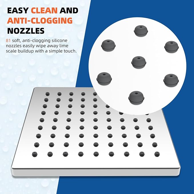 - Self-cleaning Silicone Nozzles: The rainfall shower head has 81 soft silicone nozzles, meticulously designed to prevent limescale buildup and clogging. These high-quality silicone nozzles not only ensure a safe and healthy bathing experience but also make cleaning a breeze. Wipe away any residue or buildup, and the self-cleaning properties of the silicone material will maintain the nozzles in pristine condition, ensuring an enjoyable shower every time