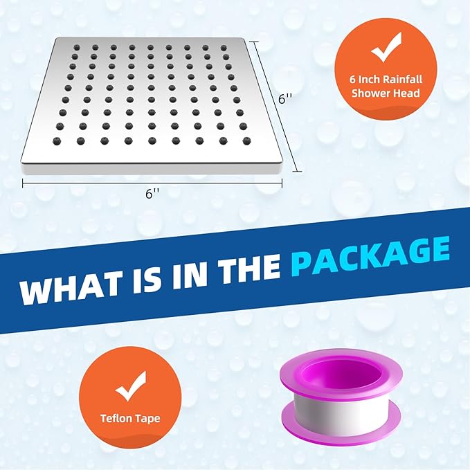 - High-quality Material: The 6-inch rainfall shower head boasts a substantial, artfully crafted body of premium ABS plastic, complemented by a back panel of certified SUS 304 stainless steel. This material composition ensures the square fixed showerhead is rustproof, lightweight, and built to withstand the test of time, and it also has an excellent elegance and durability that will serve you for years to come