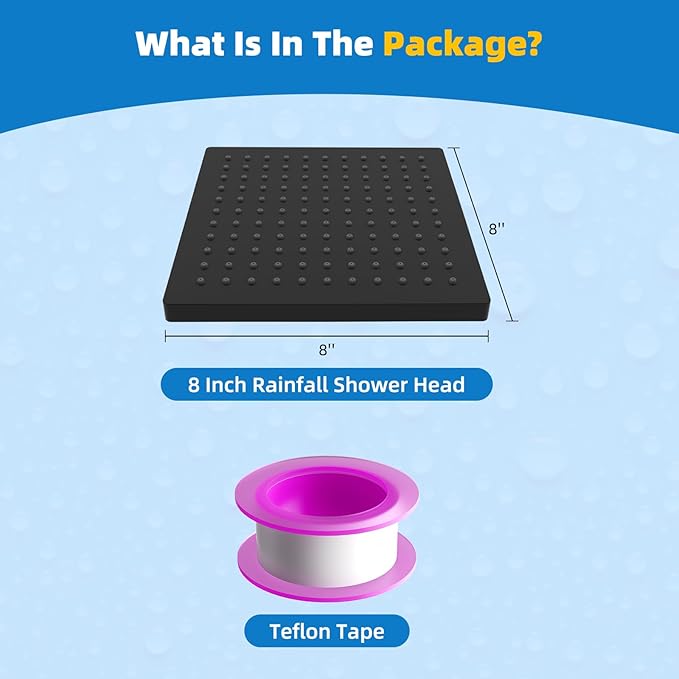 - High-quality Material: The large 8-inch rainfall shower head boasts a substantial, artfully crafted body of premium ABS plastic, complemented by a back panel of certified SUS 304 stainless steel. This material composition ensures the square fixed showerhead is rustproof, lightweight, and built to withstand the test of time, and it also has an excellent elegance and durability that will serve you for years to come