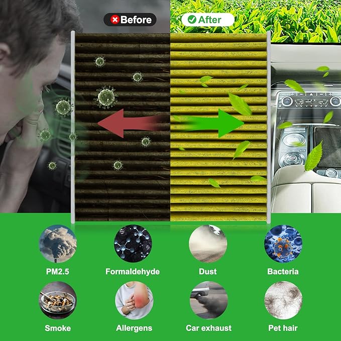 - Triple filtration technology: DacallAuto air filter adopts a 4-layer filtration structure, coconut shell activated carbon odor and a combination of microfiber and HEPA cloth, which not only effectively absorbs harmful gases and unpleasant odors, but also isolates more than 99% of dust particles, providing comprehensive protection and enjoying fresh breathing
