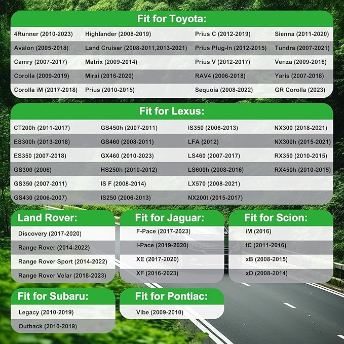 - Fit for Toyota: for 4Runner (2010-2023), for Avalon (2005-2018), for Camry (2007-2017), for Corolla (2009-2019), for Corolla iM (2017-2018), for Highlander (2008-2019), for Land Cruiser (2008-2011,2013-2021), for Matrix (2009-2014)