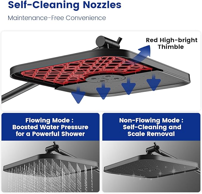 - 12-Inch Rainfall Shower Head with Auto-Clean Nozzles: Enjoy a luxurious rainfall experience with our ultra-thin 12-inch square shower head combo. The advanced air booster technology enhances water pressure, while the soft silicone nozzles with automatic descaling prevent calcium and lime buildup, ensuring consistent performance.