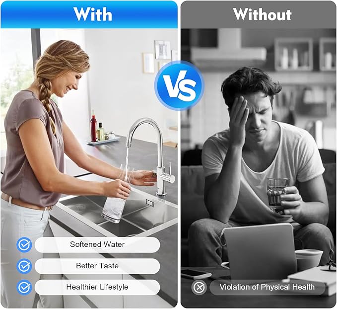 - ★Automatic Operation: It can automatically start the regeneration process according to the flow rate or time setting. You only need to add salt to the salt tank regularly, the rest of the work is done automatically by the water softener, saving time and effort