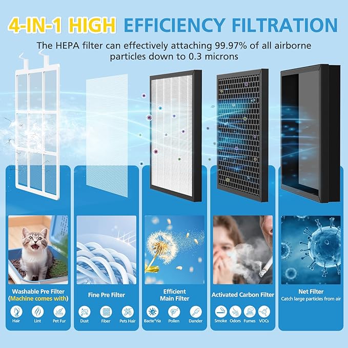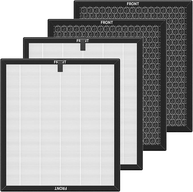 - 4-STAGE FILTRATION SYSTEM: The AP303/AP304 replacement filter features a double-sided air inlet design and a 4-in-1 high-efficiency filtration system. This system combines a Pre-Filter, Filter, Activated Carbon Filter, and Net Filter, working seamlessly to capture particles and odors in your living space. Enjoy cleaner, fresher air and a healthier home environment with this advanced filtration