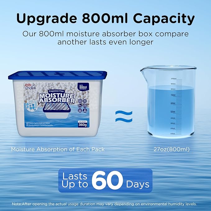 - Unscented & Extra-Large 800ml Capacity: This moisture absorber is completely fragrance-free, ensuring it won't have any unpleasant scents around you. With an 800ml collecting capacity, this moisture absorber offering extended use and fewer replacements for long-lasting dryness.