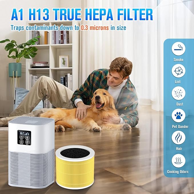 - 3-Stage Filtration: The fit for vewior air purifier filter replacement for A1 Air Pu-rifier adopts 3stage true HEPA filtration technology, which includes a Pre-Filter, H13 True HEPA Filter, and Activated Carbon Filter. This ensures it effectively clean up nearly all kinds of tiny particles as small as 0.3 microns, as well as unwanted odors, including pet dander, dust, smoke. It provides your family with clean and fresh air, promoting a healthier living environment.