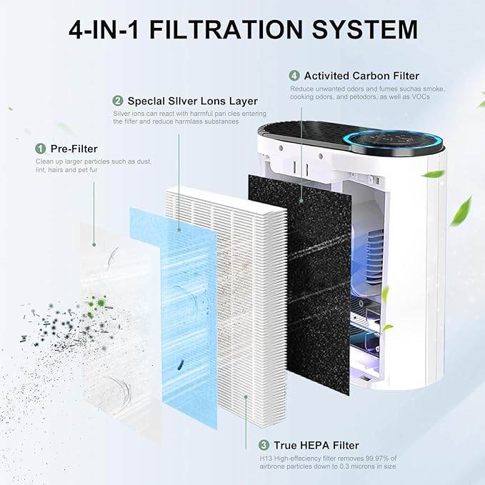 - 4-LAYER FILTRATION SYSTEM: Our air purifiers filter MK-04 is designed with a 4-in-1 High-Efficiency System. Pre-Filter, H13 True HEPA Filter, Special Coating Layer for pet, and Activated Carbon Filter. Attach to 99.97% of airborne particles like pollen
