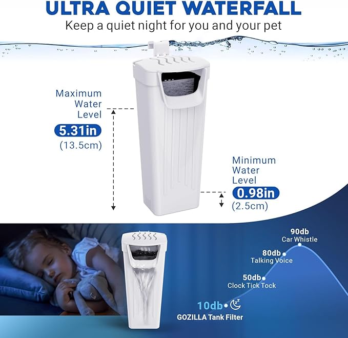 - [ULTRA QUIET MOTOR MAINTENANCE]To keep aquarium water filter waterfall flowing quietly: 1.Regularly remove the motor and rinse it with water to clear any debris. 2. Keep the water level(2.5 cm) above the water inlet area 1-2 cm to reduce noise and prevent dry burn.