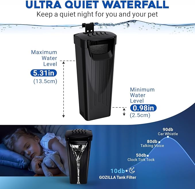 - [ULTRA QUIET MOTOR MAINTENANCE]To keep aquarium water filter waterfall flowing quietly: 1.Regularly remove the motor and rinse it with water to clear any debris. 2. Keep the water level(2.5 cm) above the water inlet area 1-2 cm to reduce noise and prevent dry burn.