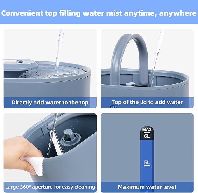 - Top-Fill Design for Convenience:Top fill humidifiers design revolutionizes refilling, letting you easily pour water directly into the tank. No tricky angles or tough openings, just pure convenience and a seamless experience.The 6L humidifier for bedrooms, large rooms,nursery, offices, indoor plant humidifiers, that is an ideal choice