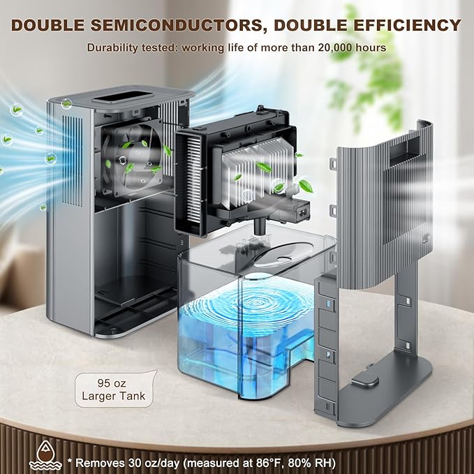 - DUAL SEMICONDUCTORS, HIGH EFFICIENCY: The dehumidifier for home effectively absorbs up to 30oz excess moisture per day (Tested at 86°F, 80% RH), keeps the room humidity below 45%-65% (*The ideal humidity level for human comfort is 40% to 60%)Basement dehumidifier is effectively eliminate damp odor and improve human comfort.