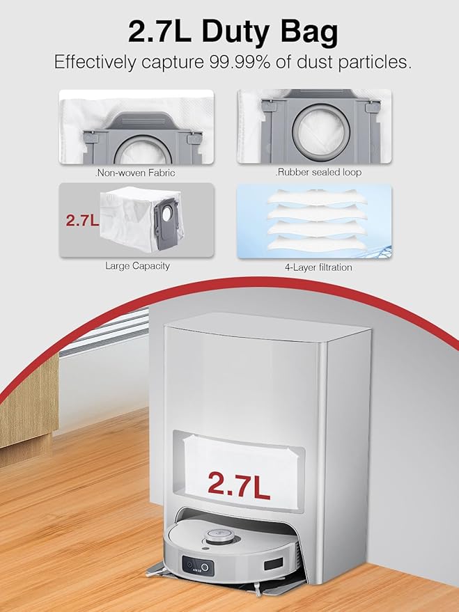 - Efficient Dust Collection: The 2.7L roborock dust collection bag, made from high-quality melt-blown fiber and non-woven fabric, effectively captures a large volume of dust, dirt, and debris while preventing any leakage. Keep your home clean and free from allergens effortlessly.