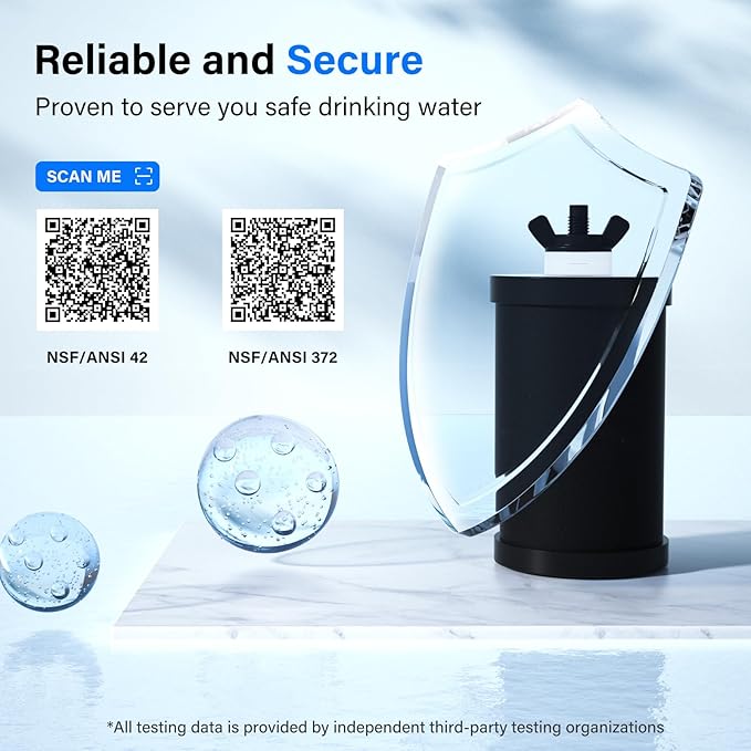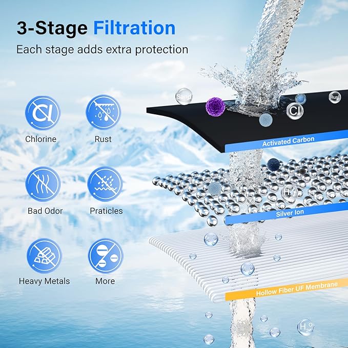 - [Advanced 3-Stage Filtration] Our composite filter is certified to NSF/ANSI 42, featuring a high-performance, 3-stage filtration technology. It combines a 0.01μm hollow fiber UF membrane, silver ion barrier, and high-density activated carbon block, providing up to 99.9% removal efficiency for chlorine, rust, sediment, organic compounds, and heavy metals. Additionally, the filter meets NSF/ANSI 372 standards for lead-free materials, ensuring safe and reliable filtration for daily use.