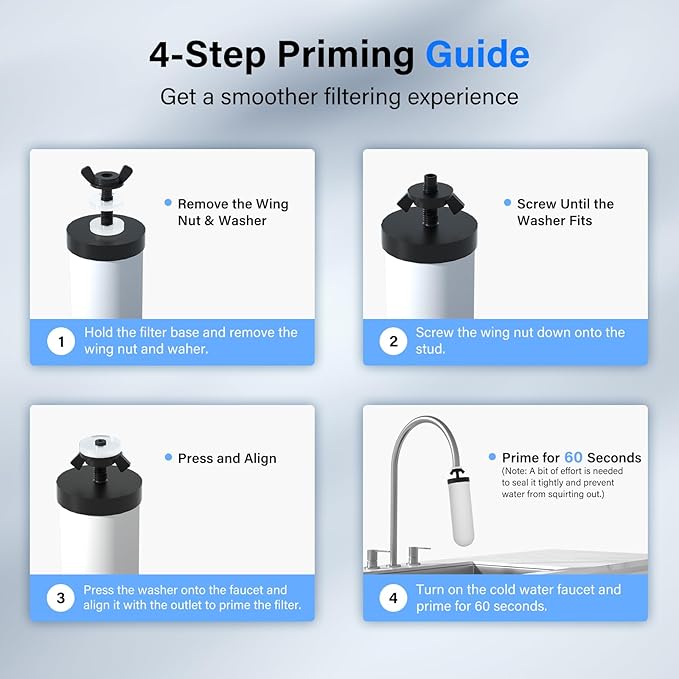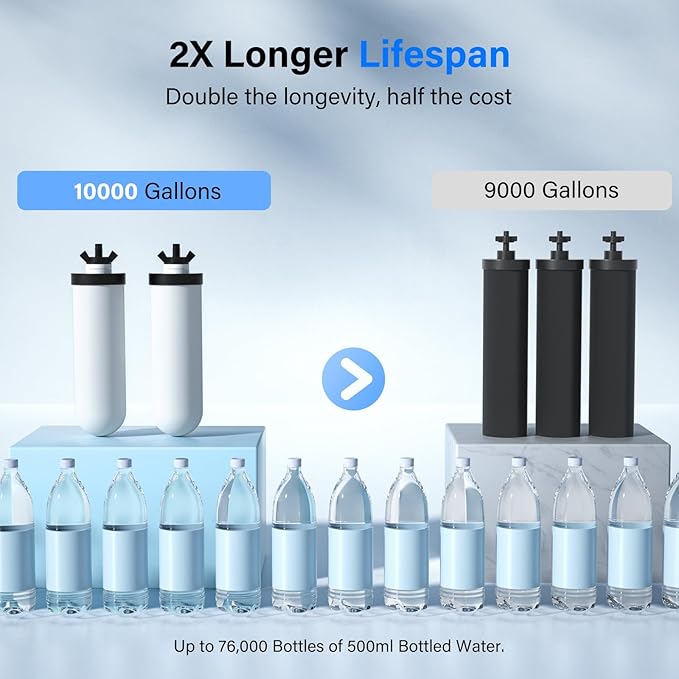 - 【Safe and Washable】The replacement for Berkey or ProOne water filter is certified against NSF/ANSI 372 standard for lead-free materials. Furthermore, this filter uses BPA-free housing, ensuring its safety. When sedimentation appear on the surface of the filter element, you can use the included sponge to scrub the surface of the filter element to extend the service life of the filter element, but do not use soap or other cleaning materials (otherwise it will clog/damage the filter pores).