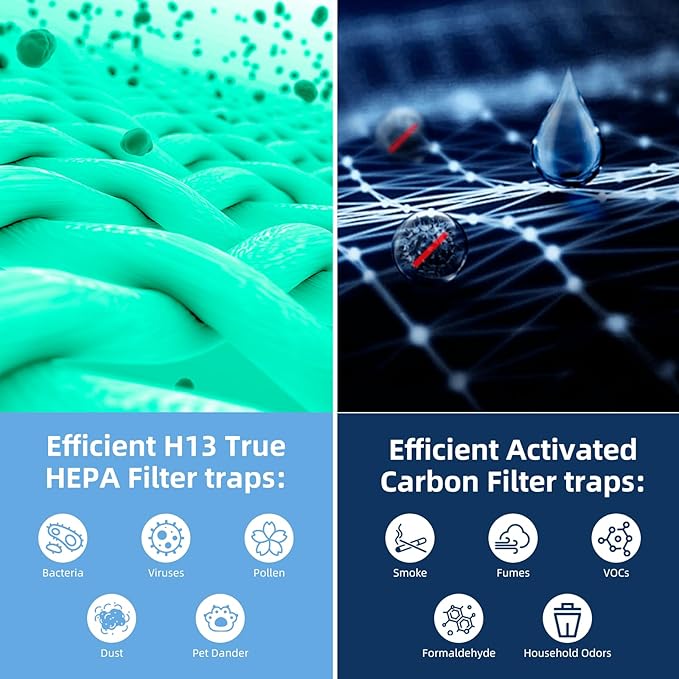 - 【H13 True HEPA Filter】:The high efficiency Core 600S HEPA air filters capture 99.99% of airborne particles and particles as small as 0.01 microns. The activated carbon prefilter absorbs smoke, cooking fumes and noxious odors from harmful volatile organic compounds.