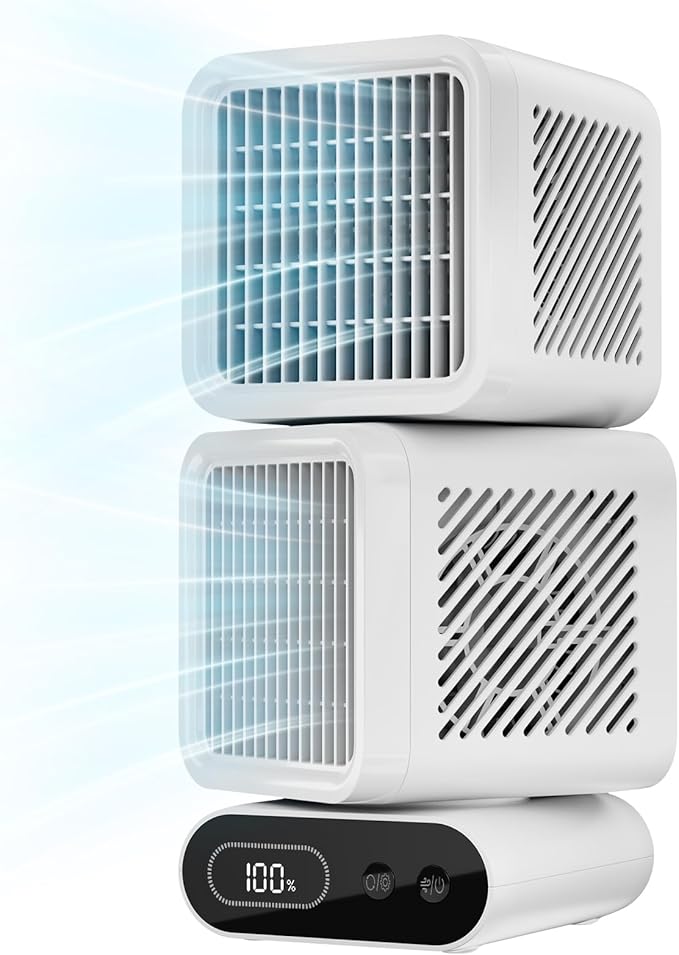 - Dual Fan Design with Independent Control – Personalized Comfort: Engineered with two powerful small fan heads, this desk fan delivers wider airflow coverage, ideal for shared workspaces or multi-angle cooling. The top fan rotates 360° manually, while the bottom fan oscillates 120° automatically. Each fan operates independently, allowing you to switch between single or dual-sided airflow for precise comfort. Whether you're cooling one spot or two, enjoy a fully customizable cooling experience