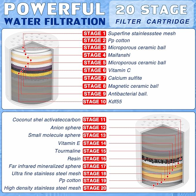 - Softening Hard Water and Take Care of Ourselves - Using a 20 stage filter cartridge softens hard water, reduces limescale deposits, and takes care of the health of us and our families, especially for people with sensitive skin and dry hair