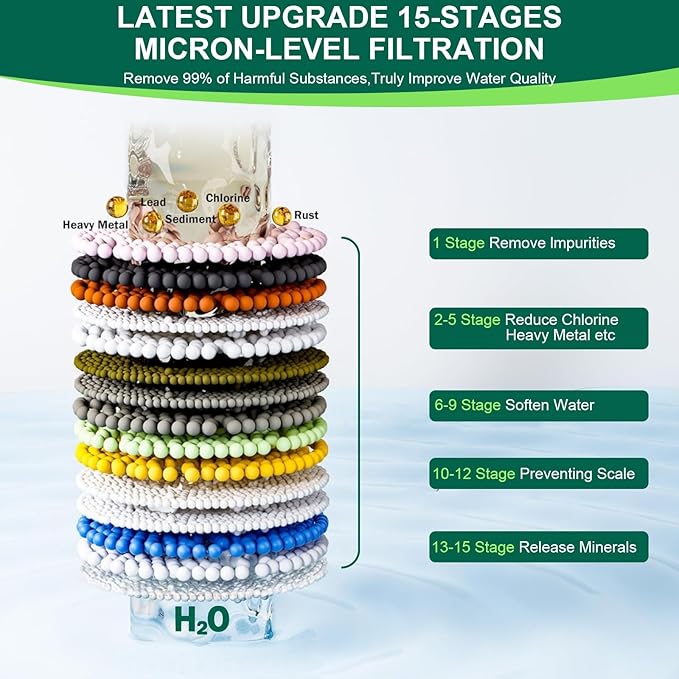 - ✅【2025 LATEST 10-STAGES FILTER TECHNOLOGY】Are you looking for a spa-like pure bathing experience? KUODIEOR bath filter for tub,features 15 advanced powerful filter media that can effectively reduces 99% of harmful impurities, including luoride, chlorine, heavy metals, rust, impurities, taste and odor, which ensure more cleaner and healthier water, reduce skin irritations, provides you and your family a pure refreshing bathing experience throughout the year