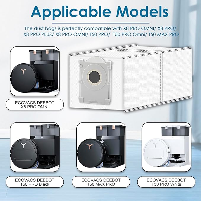 - 【Perfect Compatibility】 The Replacement Vacuum bags are compatible with ECOVACS DEEBOT X8 PRO OMNI/ T50 PRO Omni/ T50 MAX PRO Omni/ T50 PRO/ T50 OMNI/ T80 Omni/ X9 Pro Omni robotic vacuum cleaner. The the dust bag is perfectly matched, which is easy to install and easy to use. Please be noted that: This is not an OEM product. Any use of the brand name or model name is intended solely to demonstrate compatibility of this product.