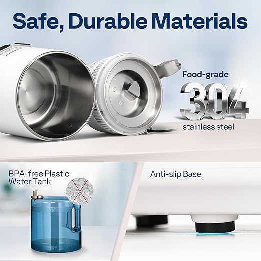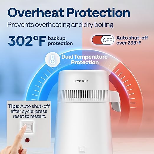 - DURABLE MATERIAL SMART DESIGN: This VIVOHOME distilled water machine is made of premium food-grade 304 stainless-steel and BPA-free plastic material, which is durable and leak-resistant; The non-slip base adds stability; Designed with an extra waterproof ON/OFF smart switch on the shell of this electric water distiller so that you can leave for a while during distillation, it is safer and convenient